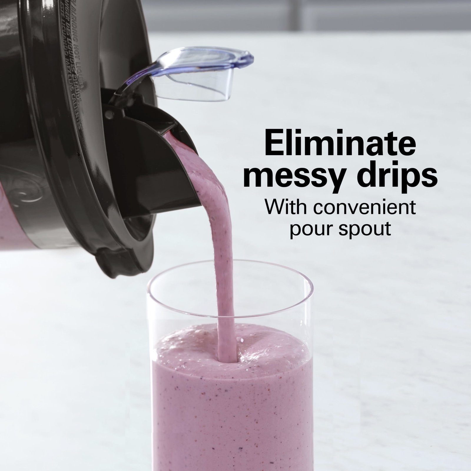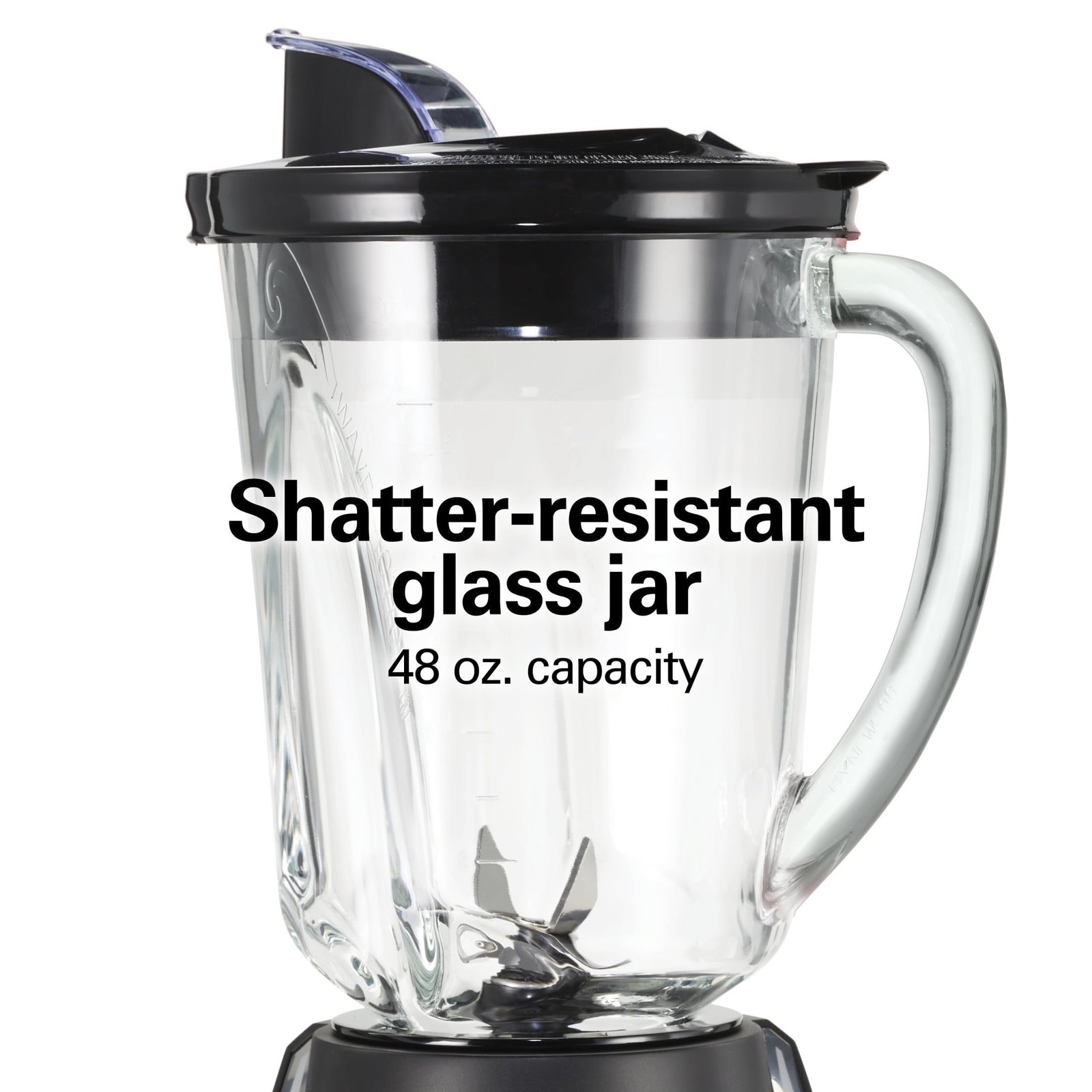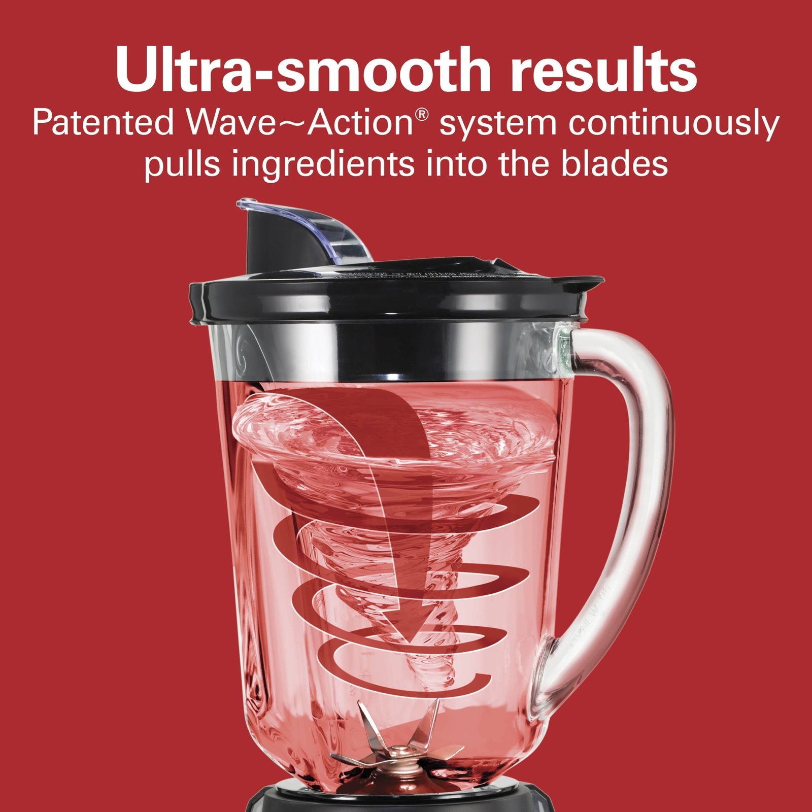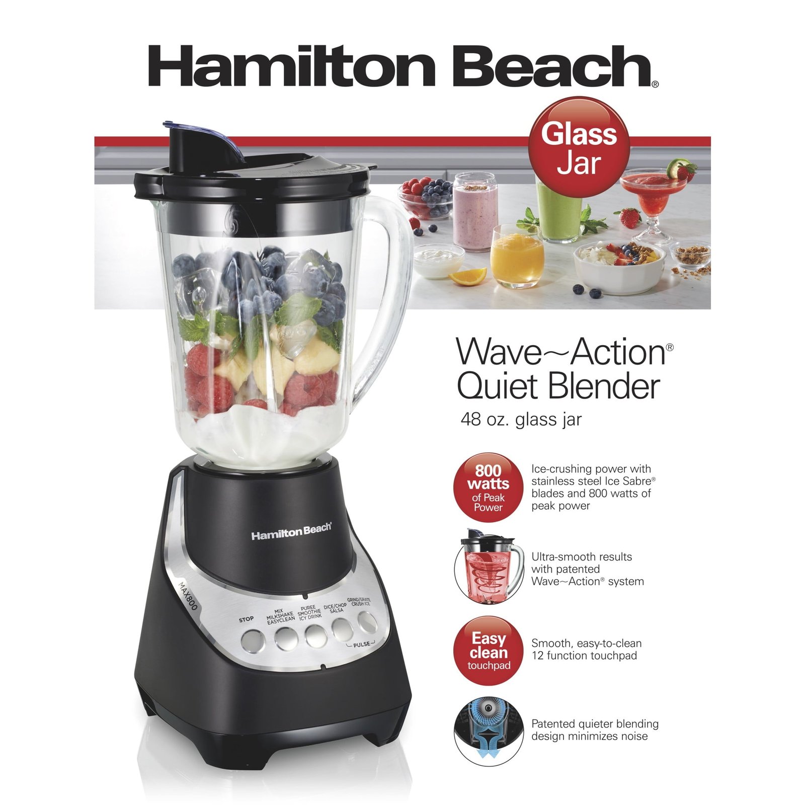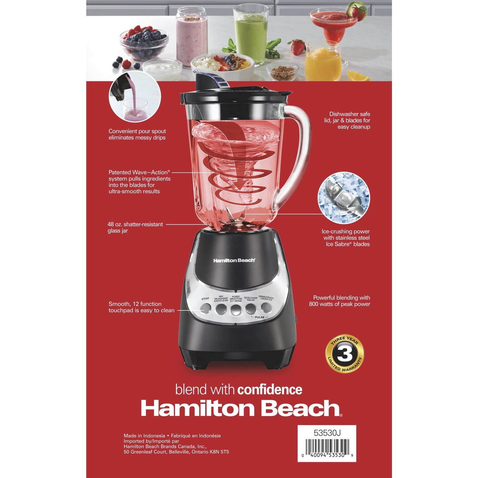 If healthy smoothies, protein shakes, and icy drinks are part of your daily routine, the Hamilton Beach® Wave~Action® Quiet Blender is a must-have kitchen essential. Equipped with ice-crushing stainless steel Ice Sabre® blades and a powerful 800-watt peak motor, it quickly blends even the toughest ingredients for smooth, satisfying results. The patented Wave~Action® System continuously pulls ingredients down into the blades, thoroughly crushing ice, frozen fruit, leafy greens, and more. The 12-function touchpad offers maximum versatility with clearly labeled buttons—no guesswork needed. Built with a quieter blending design, it reduces noise while delivering powerful performance. Perfect for serving family or guests, the 48 oz. shatter-resistant glass jar is both durable and spacious, with a mess-free pour spout to prevent drips. Backed by a 3-year limited warranty, this blender is designed for long-lasting use in any kitchen.