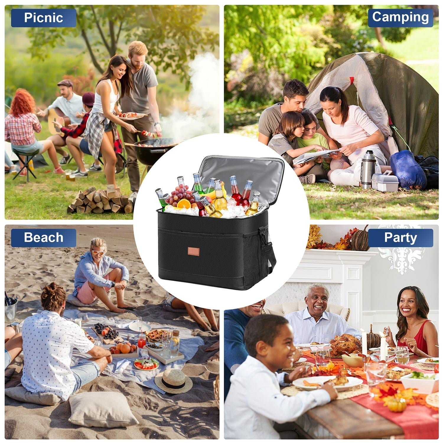 Soft-sided cooler bag with extra-large size yet weighs only 1.8 lbs. The camping cooler bag will hold up to 48 cans of your favorite drinks plus 4-8 ice packs. Whether camping, hiking, picnicking, or a BBQ party, this insulated cooler bag easily packs a lot of food, fruits, beer, meat, or even seafood together. Exterior surfaces are made of rip-stop 600D Oxford fabric materials plus one layer of waterproof PVC. Interior layers are thicker, reinforced food-grade PEVA materials with seamless ultrasonic welding for 100% leakproof and tear-resistance. A built-in EPE foam middle layer and 210D liner add additional insulation, allowing the soft sided cooler bag to keep food or drinks cold for up to 20 hours.