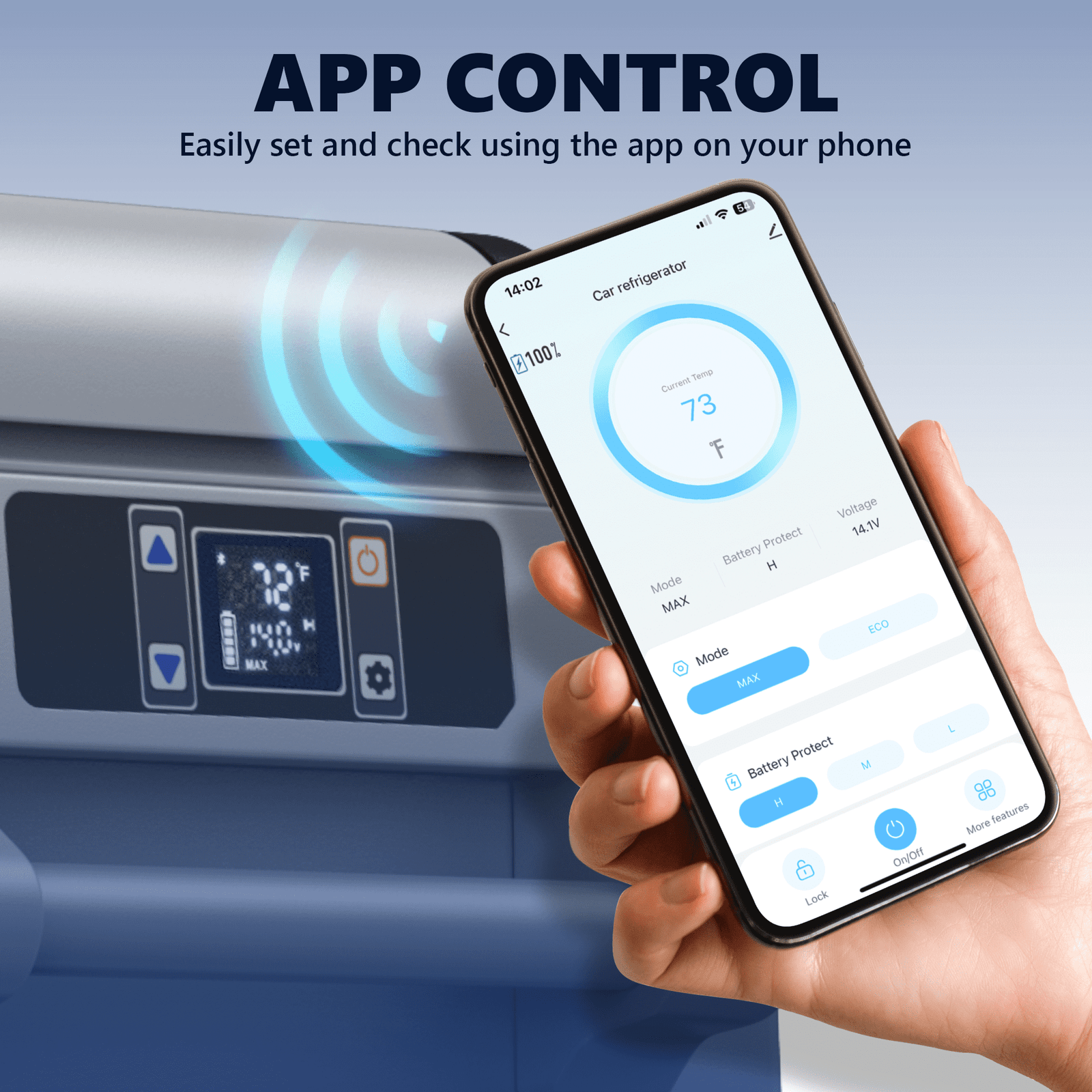 • This 12 volt fridge comes with an LCD touch screen that allows easy monitoring and adjustment of temperature (-4℉-68℉) for your convenience. Choose between ECO and Max modes to suit your preferences. Additionally, the Bluetooth connectivity and mobile app enable remote control of the powered cooler, enhancing overall convenience.